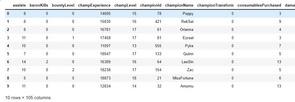 그리고 10명의 참가자로 구성된 10개의 row는 순서대로 blue팀과 red팀의 라인 순서로 정렬이 되어있었다.