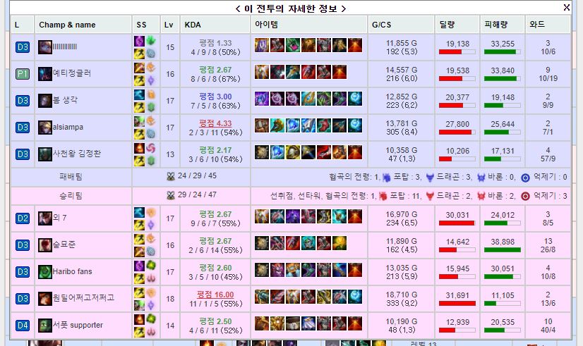 몇 킬 몇 뎃 몇 어시였고, 바론을 몇 번 먹었고, 최종 아이템은 무엇이고, 총 몇의 데미지를 주고 받았는지 이런 식이다.